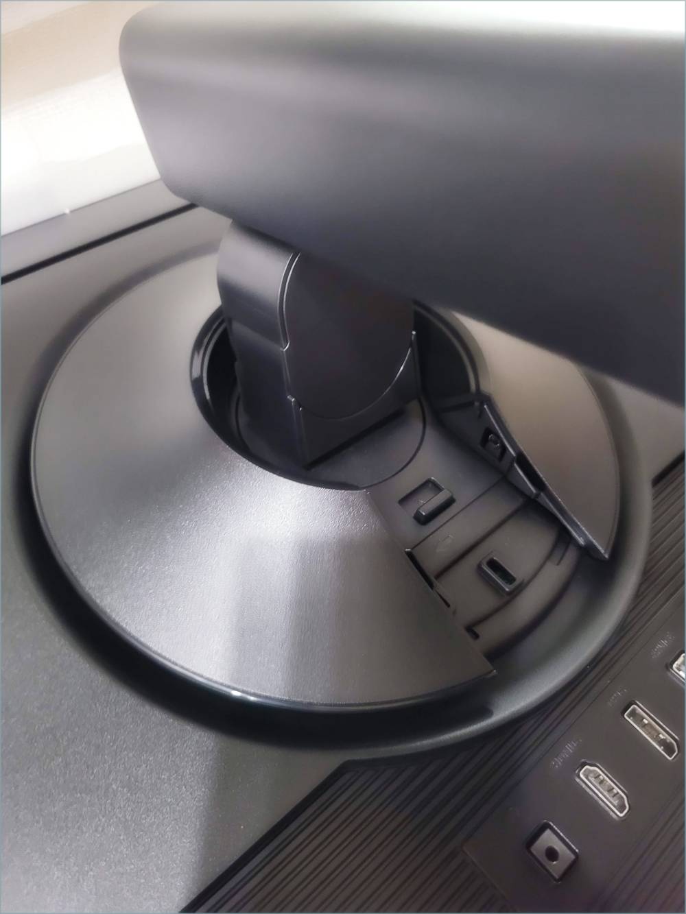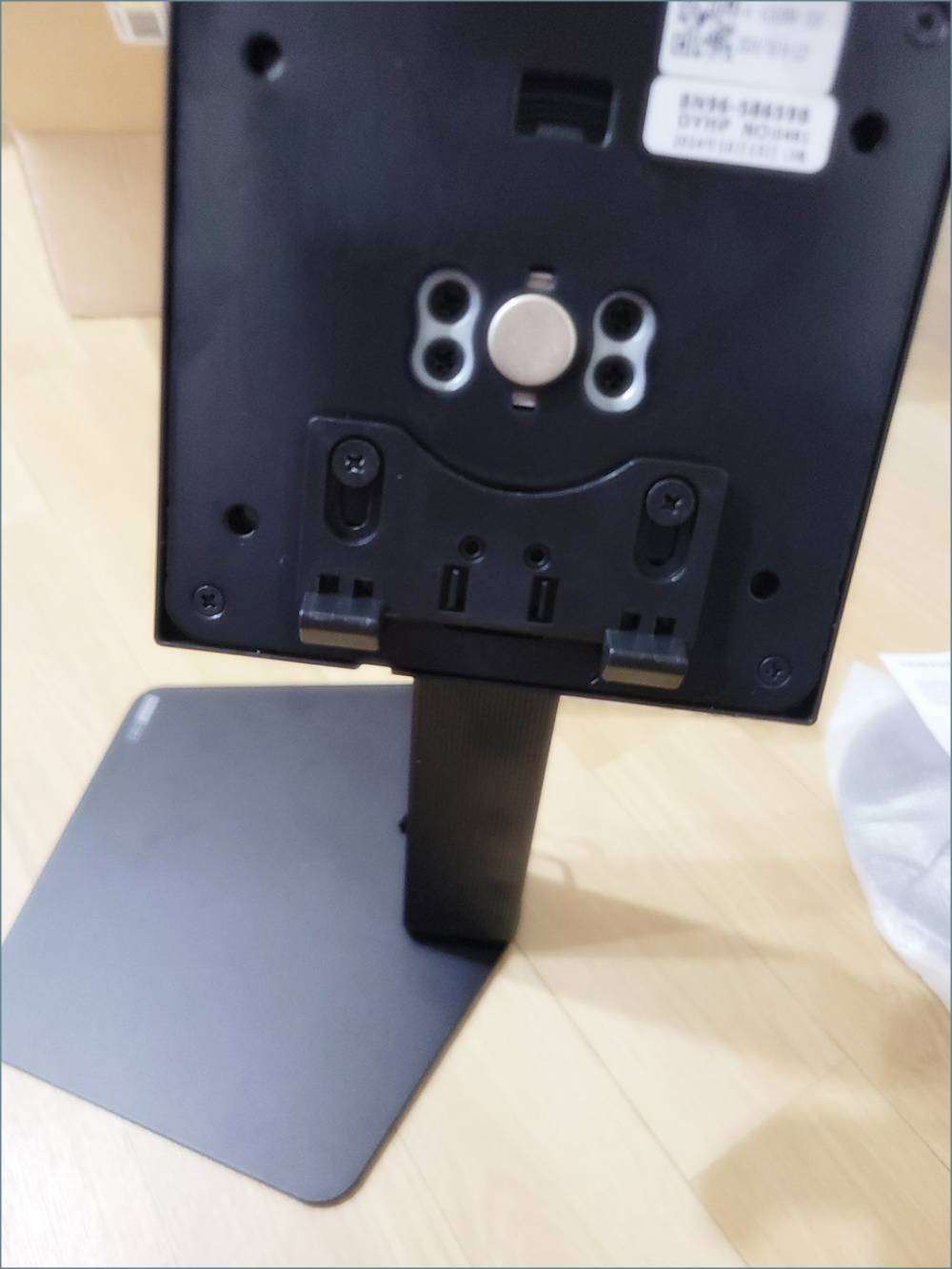 VESA홀 위에서부터 받침대와 연결해주면 딸깎소리와 함께 결합